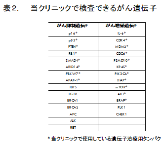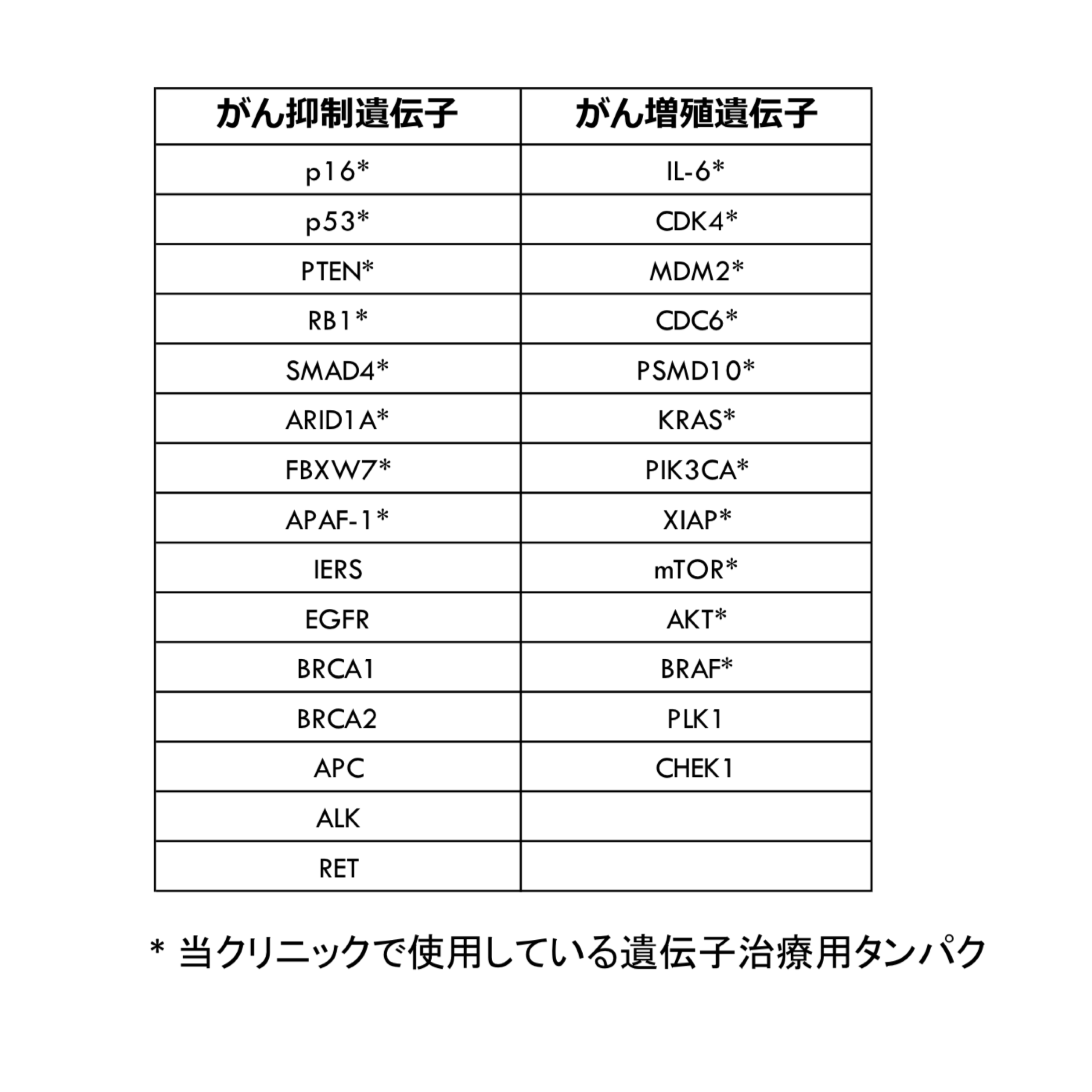 此外,我们诊所还将通过KayteeBio公司开发的基因检测方法,测量CTC中的癌抑制基因和癌增殖基因。表2列出了我们诊所可以测量的CTC中的癌抑制基因和癌增殖基因的列表。*标记表示目前我们诊所正在使用的基因治疗蛋白中已经包含的基因。我们诊所将预先测量患者CTC中的癌抑制基因和癌增殖基因,并根据情况选择缺乏的癌抑制基因作为基因治疗蛋白进行投注,并通过使用抑制RNA作为基因治疗蛋白(抑制RNA)进行投注来抑制过度表达的癌增殖基因,从而选择并投注有效的基因治疗蛋白。因此,我们提供针对每位患者定制的个性化基因治疗。