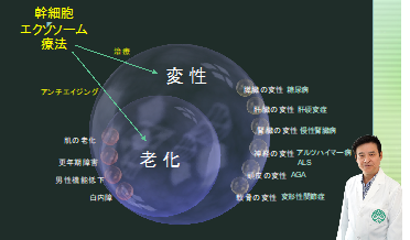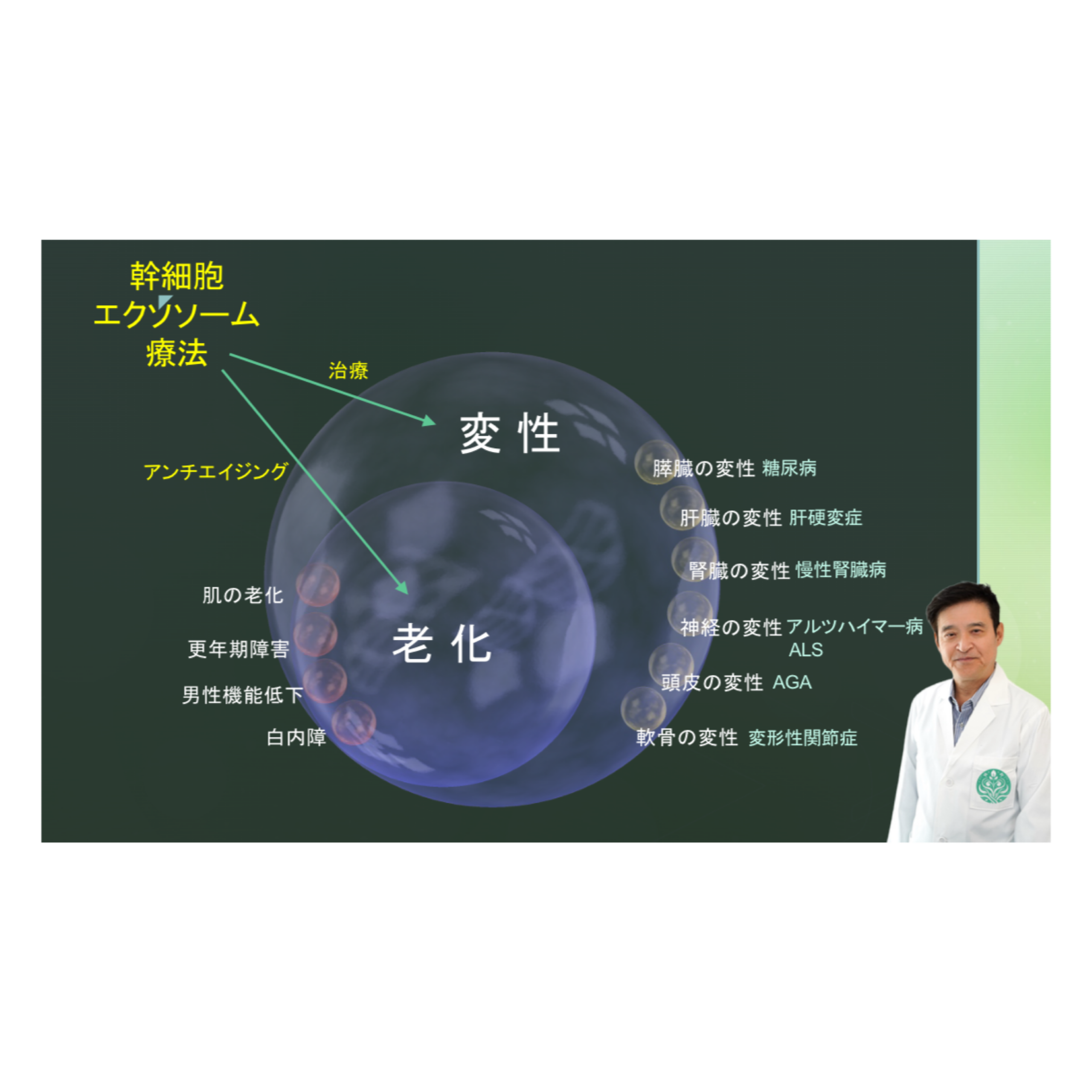 幹細胞和外泌物在抗衰老方面發揮作用,對於各種細胞逐漸變性的變性疾病則以治療形式發揮效果(見圖5)。具體來說,它具有緩解和修復老化引起的白內障、男性功能下降、更年期障礙、皮膚老化等的能力。另一方面,變性疾病包括隨著胰臟變性而出現的糖尿病、隨著頭皮變性而出現的AGA(男性型禿頭)、隨著神經變性而出現的阿爾茨海默病和ALS(肌萎縮性側索硬化症)、隨著軟骨變性而出現的變性性(膝蓋)關節炎、隨著肝臟變性而出現的肝硬化,或隨著腎臟變性而出現的慢性腎臟病等,幹細胞和外泌物被認為具有對這些疾病進行緩解和修復的治療能力。